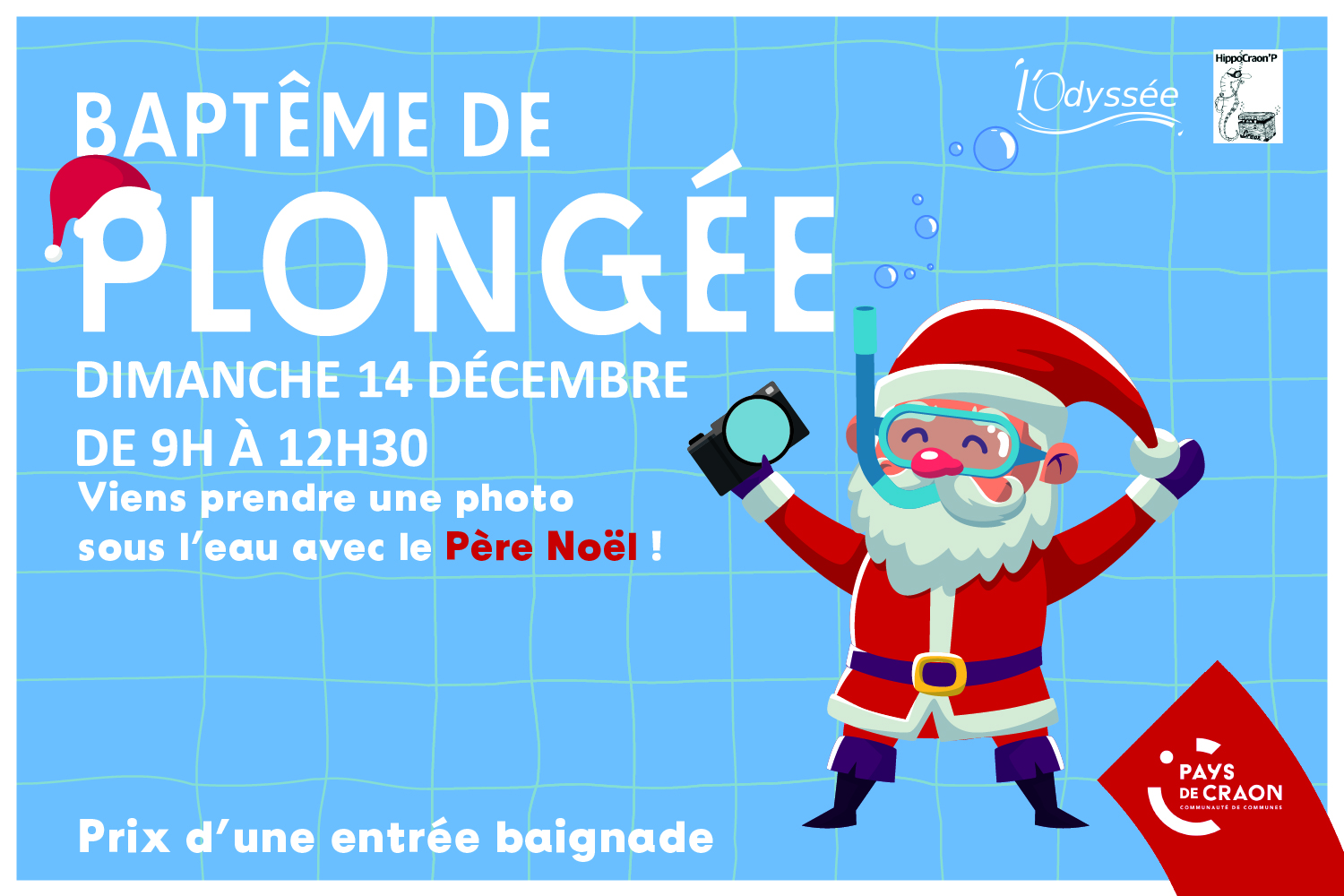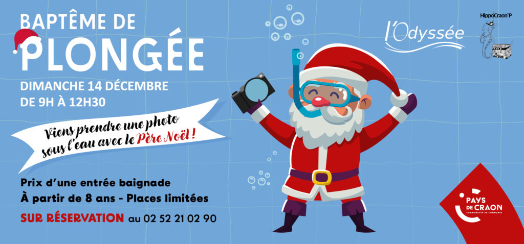 Préparez-vous pour une expérience unique en cette période de fêtes ! Le dimanche 14 décembre, de 9h à 12h30, votre centre aquatique propose, en partenariat avec le club de plongée HippoCraon’P une activité exceptionnelle : un baptême de plongée, et en bonus, réaliser gratuitement une photo inédite avec le Père Noël sous l’eau. L’occasion parfaite pour immortaliser ce moment.